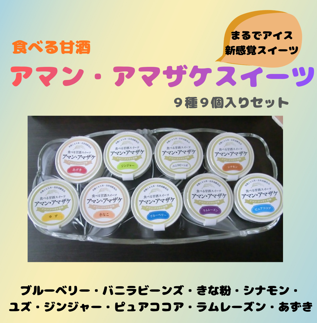 【食べる甘酒】アマン・アマザケスイーツ 9種×9個入り 砂糖・添加物不使用のアマザケスイーツ新フレーバー追加!9種類セットでお届けします自家製の米麹ともち米のみで仕込んだ自然発酵食品です。砂糖・添加物は使用しておりません。また、工場直送の高品質生クリームを使用。すべてのフレーバーの素材は自然食材を使用。アルコール0%、アイスクリームのように食べられる唯一無二のアマザケスイーツです!アマザケは発酵過程でさまざまな酵素を生成します。しかし既存の(瓶・缶詰)甘酒は高温煮沸行程によって酵素が破壊されてしまっている状態です。「アマン・アマザケ」はその酵素を温存させる工夫をしています。またアマザケには腸内フローラの改善に役立つ成分がたくさん含まれています。甘さの元であるブドウ糖は疲労回復によいとされ、その他のアミノ酸やビタミン、その他多くの栄養素が豊富に含まれています。小さなお子様からご高齢の方までお召し上がりいただけます。以前よりさらになめらかさがアップした、凍ったままの新感覚の「アマン・アマザケスイーツ」をお楽しみください。 販売価格 4,320円(税込み) 会員価格 (税込み) 通常価格 (税込み) 在庫 商品コード k-01168 JANコード 数量 - + カートに入れる カテゴリー 甘酒 商品名:アマン・アマザケ全種セット(9種×9個)保存方法:【要冷凍】-15℃以下に保存原材料:<ブルーベリー>内容量 60g×1個米麹、もち米(大分県産)、クリーム(九州製造)、ブルーベリー(大分県産)<バニラビーンズ>内容量60g×1個米麹、もち米(大分県産)、クリーム(九州製造)、バニラビーンズ<きな粉>内容量60g×1個米麹、もち米(大分県産)、クリーム(九州製造)、きな粉(北海道産)<シナモン>内容量60g×1個米麹、もち米(大分県産)、クリーム(九州製造)、有機シナモン<ジンジャー>60g×1個米麹、もち米(大分県産)、クリーム(九州製造)、有機ジンジャー<ユズ>内容量60g×1個米麹、もち米(大分県産)、クリーム(九州製造)、柚子ペースト(九州産)<ピュアココア>内容量60g×1個米麹、もち米(大分県産)、クリーム(九州製造)、ピュアココア(オランダ産)<ラムレーズン>内容量60g×1個米麹、もち米(大分県産)、クリーム(九州製造)、有機レーズン、ラム酒<あずき>内容量60g×1個米麹、もち米(大分県産)、クリーム(九州製造)、小豆(北海道産)製造:アマン・アマザケ本舗/大分県国東市武蔵町三井寺387番地代表者:阿萬 修三 ツイートする シェアする