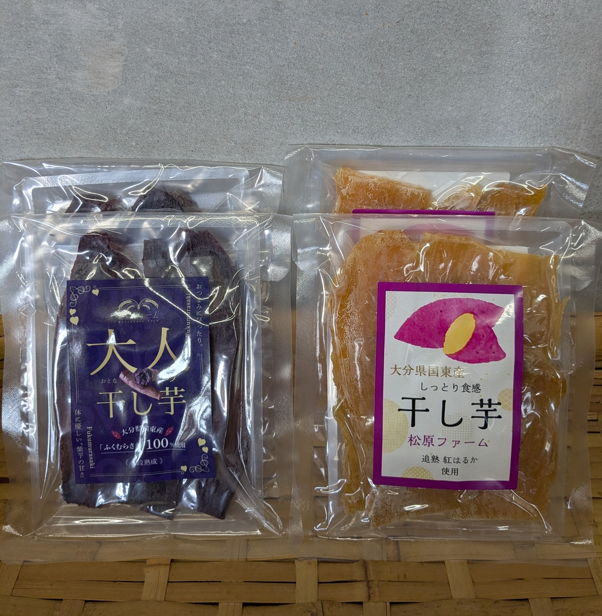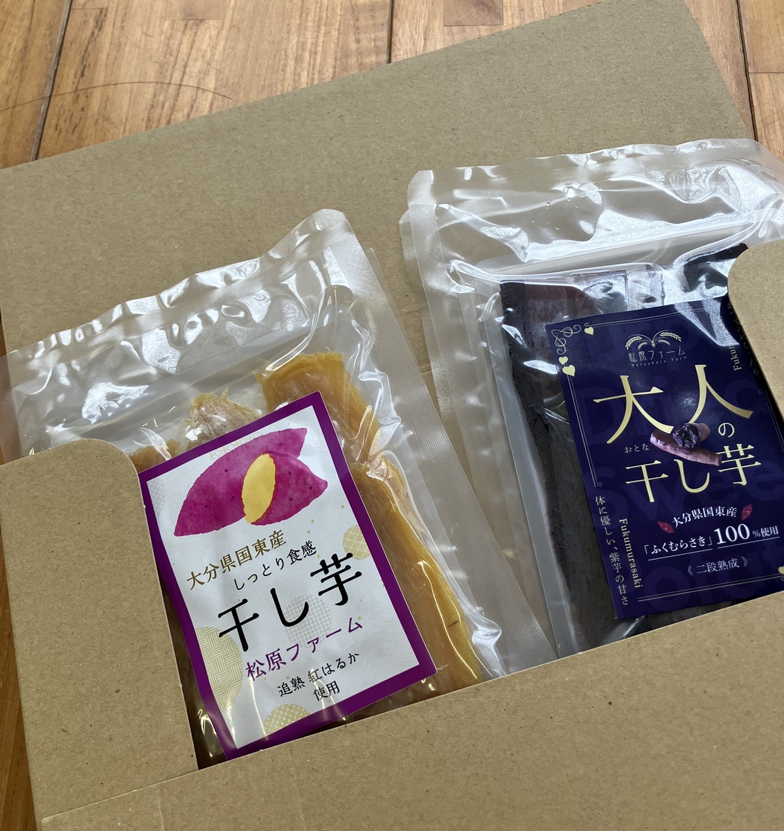 【満腹干し芋4個セット】国東産追熟紅はるか干し芋90g×2、ふくむらさき大人の干し芋80g×2(株式会社松原ファーム) 追熟紅はるかと追熟ふくむらさきの干し芋のセット🍠 松原ファームから、人気の「追熟べにはるか 干し芋」と、新商品「追熟ふくむらさき 大人の干し芋」のお得なセットが誕生しました! ニューフェイス「追熟ふくむらさき 大人の干し芋」は、ふくむらさき一株から使用できる量が限られている為(干し芋に適した太さや長さ)、選りすぐりの原料だけで作った特別な干し芋。生芋由来の色鮮やかな色が特徴で、「追熟紅はるか干し芋」と同じ「二段熟成」によって引き出された濃厚な甘みが特徴です!上品な甘さはワインやウイスキーなど、お酒のおともにもぴったりです!食べ比べも楽しい満福セットです。 販売価格 2,500円(税込み) 会員価格 (税込み) 通常価格 (税込み) 在庫 商品コード k-00987 JANコード 数量 - + カートに入れる カテゴリー じゃがいも、さつまいも、里いも、菊いも 商品容量追熟紅はるか 90g×2袋追熟ふくむらさき80g×2袋※賞味期限が5か月以上のものをお送りします。※直射日光、高温多湿を避け保存原材料名さつまいも(大分県国東市産)提供/製造製造/日本農林産食品製造株式会社(大分県日田市大字石井716-1)提供/株式会社松原ファーム(大分県国東市安岐町中園1043) ツイートする シェアする